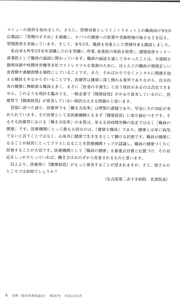 【愛知県病院協会 会報 第287号 掲載「医療界にも『健康経営』の普及を」】石川学長