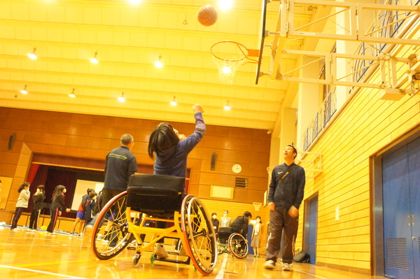 その後は実際に競技用車イスに乗って、動かしたり、シュートを打つなど体験してもらいました。元気いっぱいで大変盛り上がりました。